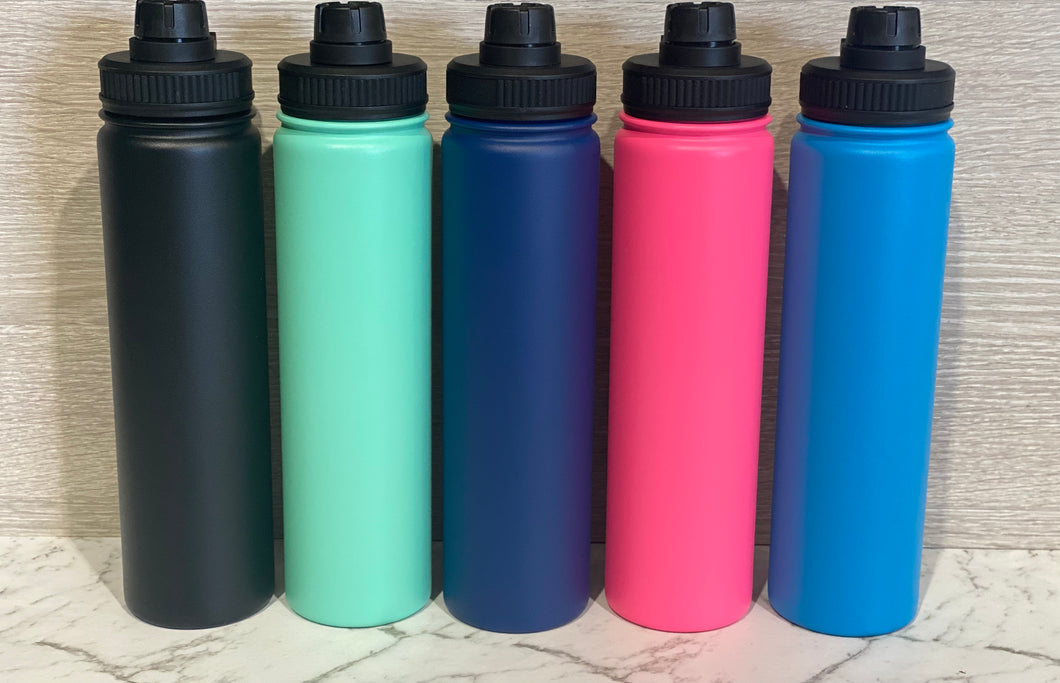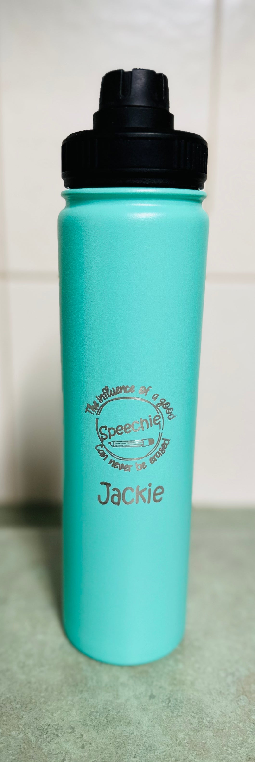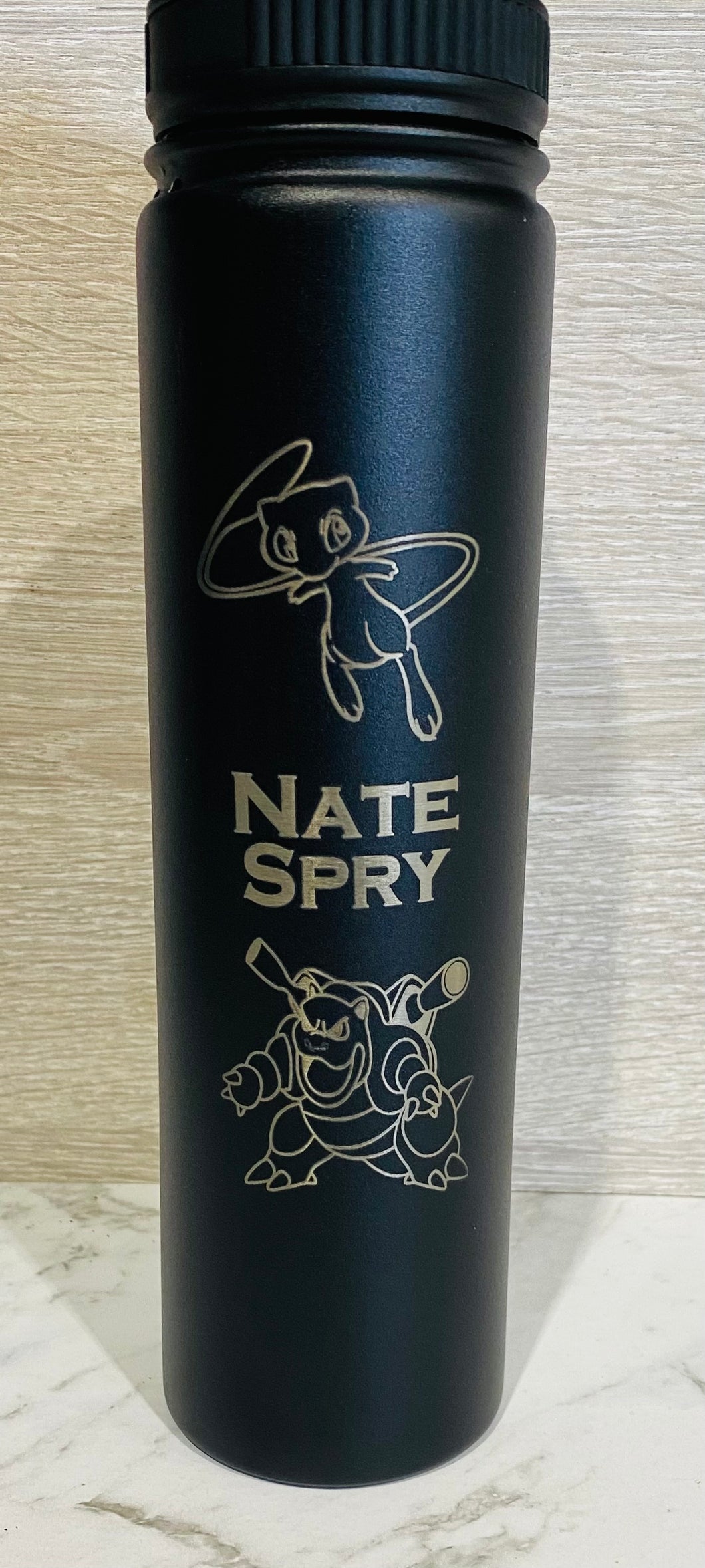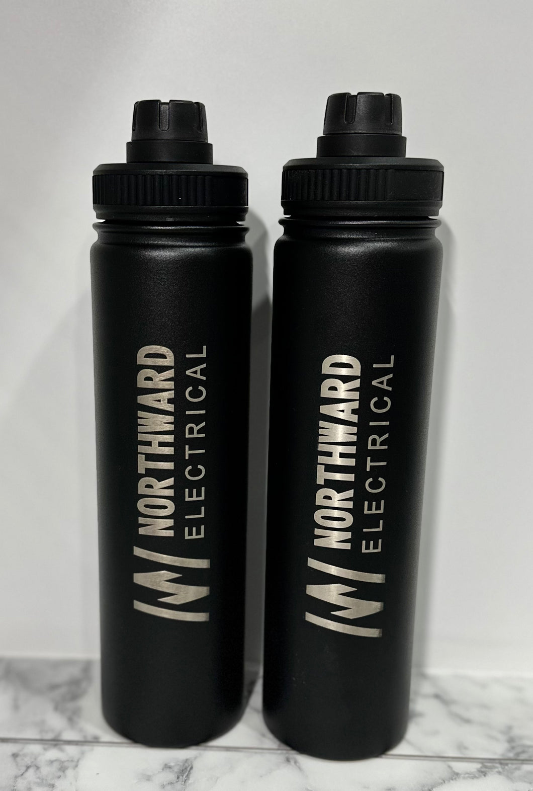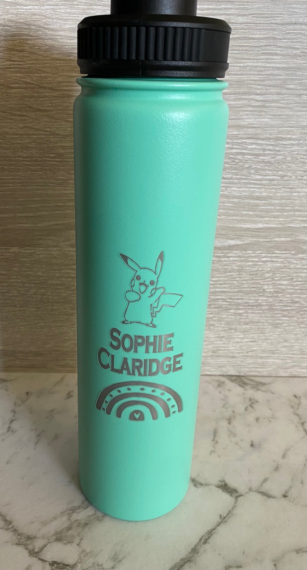 750ml Drink Bottles with a name etched vertically and centred onto the bottle.