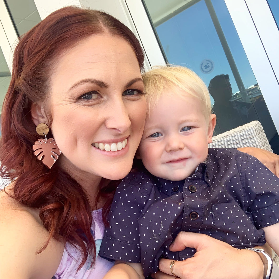 These gorgeous earrings are made with a bamboo circle that clips behind the ear and an acrylic monstera leaf that drops below. They shape the face so beautifully.